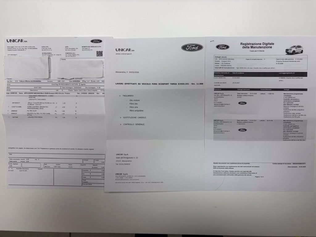 TAGLIANDI DI MANUTENZIONE ESEGUITI PRESSO NOSTRA OFFICINA UFFICIALE FORD, RICEVUTE DIMOSTRABILI: