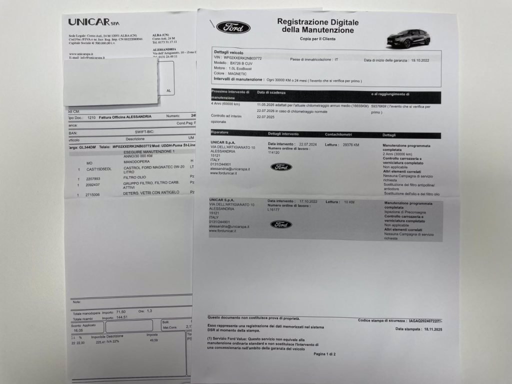 TAGLIANDO DI MANUTENZIONE ESEGUITO PRESSO NOSTRA OFFICINA UFFICIALE FORD , RICEVUTA DIMOSTRABILE.