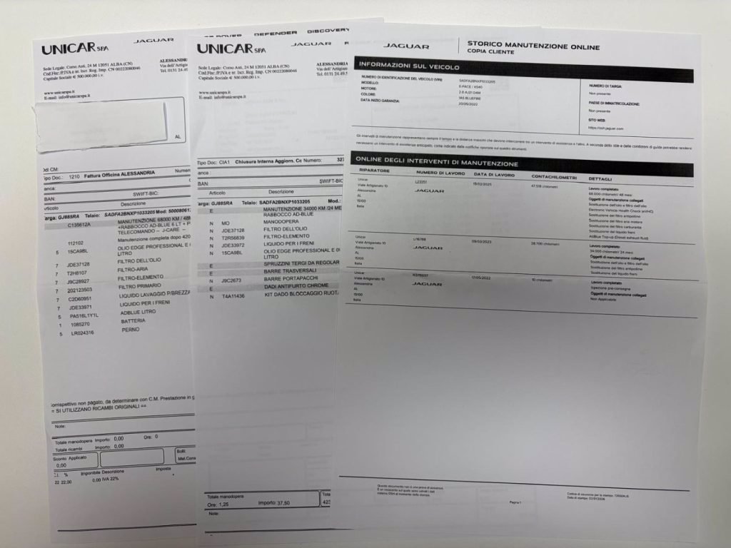 TAGLIANDI DI MANUTENZIONE ESEGUITI PRESSO NOSTRA OFFICINA UFFICIALE JAGUAR , RICEVUTE E ATTESTATO SERVICE DIMOSTRABILI: