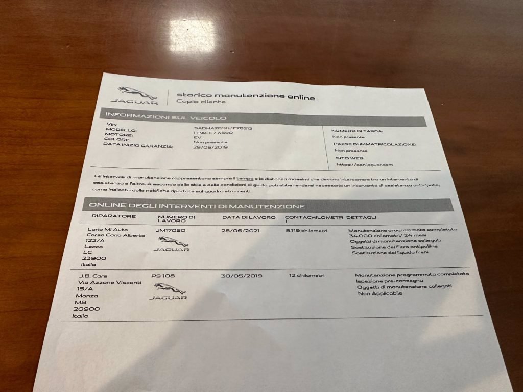 Manutenzione eseguita presso rete ufficiale Jaguar.