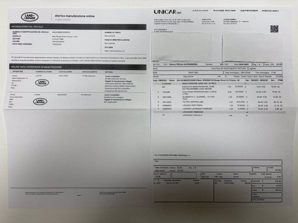 TAGLIANDO DI MANUTENZIONE ESEGUITO PRESSO NOSTRA OFFICINA UFFICIALE LAND ROVER, -RICEVUTA DIMOSTRABILE: