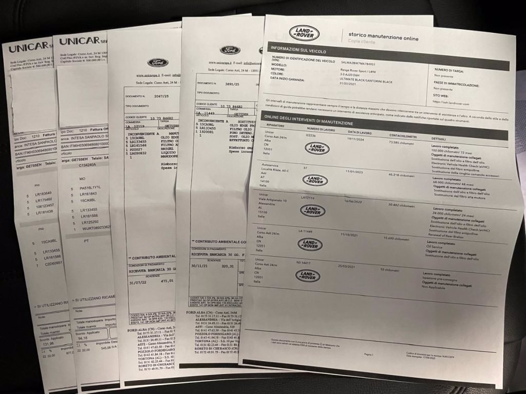 TUTTI I TAGLIANDI DI MANUTENZIONE ESEGUITI PRESSO OFFICINA UFFICIALE LAND ROVER, RICEVUTE E ATTESTATO SERVICE DIMOSTRABILI.